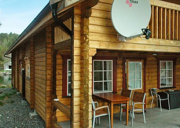 Two-Bedroom Holiday Home In Vagland 7 ligt 3 km verwijderd van het Geitbat Museum en nodigt gasten uit om te ontspannen op een terras.